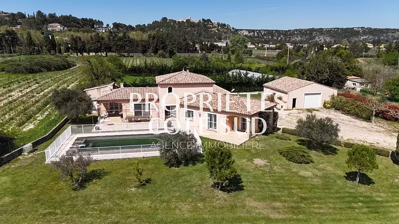 Le jardin verdoyant avec oliviers et arbres fruitiers agrémenté de sa piscine chauffée de 10,5 x 4,5 m.Terrasse d'environ 100 m2.