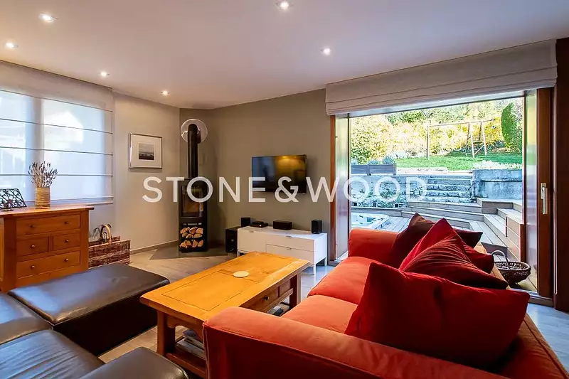 Parfaitement rénovée et entretenue, elle offre de confortables espaces dans un esprit chalet. La pièce de vie s'articule autour d'une belle cuisine équipée avec îlot central, ouverte sur un salon TV agrémenté d'un poêle à bois. Aux beaux jours, la vie se prolonge sur la grande terrasse, autour du jacuzzi, dans un cadre verdoyant à l'abri des regards.