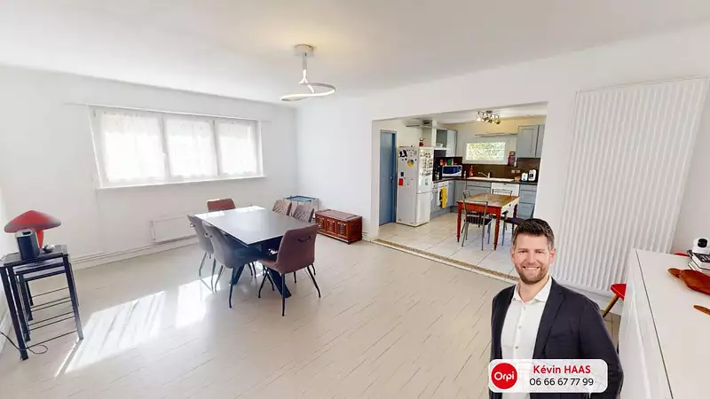 À gauche, un salon confortable, à droite une salle à manger lumineuse, parfaite pour les repas en famille. La cuisine ouverte, fonctionnelle et équipée d'un cellier, prolonge agréablement l'espace de vie.