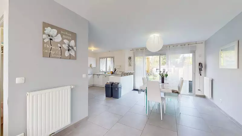 En fond de parcelle, une maison en béton brute de 40m² avec jardin privatif. La maison principale est équipée de volets roulants électriques pour un confort moderne.