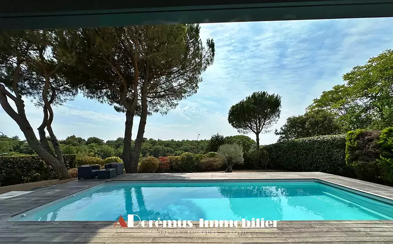 À l’extérieur, profitez d’une superbe terrasse en ipé couverte par une pergola bioclimatique, d’une piscine chauffée et d’un terrain clos et paysagé d’environ 1240 m2, en position dominante avec une vue dégagée.