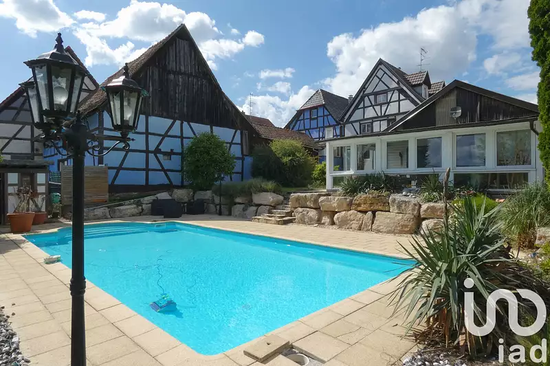 iad France - Pascal Loeb vous propose: Belle maison alsacienne de 193 m² habitable, avec grand terrain de 15,24 ares, équipée d'une grande piscine muni de son local technique et d'un pool-house. Cette maison entretenue, disposant d'une belle hauteur sous plafond et dotée d'une isolation, propose de beaux espaces de vie sur 3 niveaux. Au rez-de-chaussée la maison est composée d'une entrée, d'une salle à manger avec le charme de poutres et de colonnes en bois, d'une cuisine équipée, plus loin nous avons une buanderie, un wc séparé, une chambre de 15,25 m² avec sa propre salle de bain munie d'une baignoire d'angle, d'une cabine de douche et d'un meuble double vasque. Au 1er étage un palier dessert deux chambre de 15,22 et 10,90 m², une salle de bain avec baignoire, wc et meuble vasque, un salon de 21 m², ainsi qu'un bureau. Au 2ème étage un immense salon de plus de 46 m² habitable permettant de multiples configurations. Au sous-sol nous avons une cave composée d'une chaufferie et d'une cave à vin.