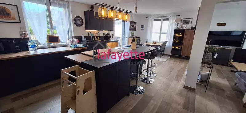 Une cuisine ouverte sur le séjour salon ( cheminée avec insert) et donnant sur une grande terrasse .