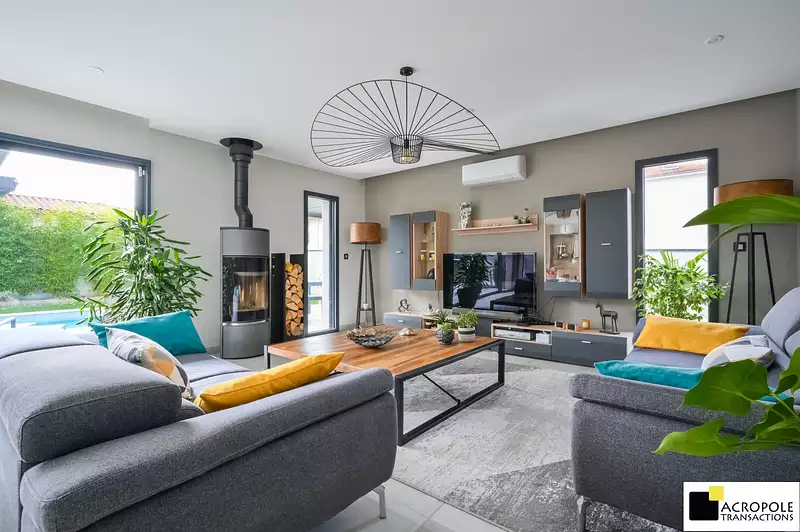 Venez découvrir, cette maison contemporaine de 2021, située sur la commune de Lentilly. Composée, au rez de chaussée, d'une cuisine équipée ouverte sur la pièce de vie d'une superficie de 70 m2 environ, d'une suite parentale de 25 m2 environ avec salle d'eau et wc, d'un espace indépendant avec douche et wc, pouvant faire office de bureau, de studio ou de chambre d'amis. A l'étage nous trouvons trois chambres, une salle de bains et un wc. Le bien est complété par un garage double avec porte automatique. A l'extérieur nous retrouvons un patio exposé EST et une immense terrasse donnant sur une piscine exposée SUD/OUEST. Propriété édifiée sur un terrain d'une superficie de 611 m2 environ, clos de murs, piscine chauffée et puits. Belle prestations : huisseries aluminium, pompe à chaleur air/eau, système d'alarme, volets roulants aluminium isolant avec fermeture centralisée, climatisation, poêle à bois ... Produit rare à la vente.