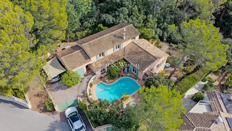 Nichée au coeur du domaine des Golfs de Valescure, cette élégante villa indépendante de 175 m² séduit par son charme authentique et son environnement verdoyant. Édifiée sur un terrain paysagé de 885 m², elle offre un superbe cadre de vie avec piscine, terrasses ensoleillées et espaces de détente à l'abri des regards. Spacieuse et lumineuse, la villa propose un séjour plein sud de 51 m², une cuisine indépendante entièrement aménagée et équipée, trois chambres dont une suite de plain-pied, ainsi qu'une salle d'eau et une salle de bains. Elle bénéficie de prestations de confort telles que la climatisation réversible, un garage et plusieurs stationnements. Un appartement T2 indépendant ouvrant directement sur le jardin vient parfaire l'ensemble. Calme, nature et élégance caractérisent cette propriété, idéale pour les amoureux de la Côte d'Azur en quête d'une résidence principale ou secondaire à proximité immédiate des golfs et des plages. Mickael MERESSE (EI) Agent Commercial - Numéro RSAC : 811 785 302 - Frejus.