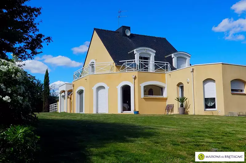 Vous recherchez une jolie propriété à la campagne, à moins de 15 km de LORIENT ? Voici une très jolie VILLA contemporaine avec PISCINE proposée par MAISONS de BRETAGNE. La propriété est très bien entretenue et conviendra à une grande famille, elle propose également un appartement privatif de 2 pièces + Kitchenette, idéal pour habitat partagé ou location saisonnière . Située dans un petit hameau paisible à 3 km des premières commodités d'une commune du pays de Lorient, elle est proposée sur un terrain de 2 200 m2 agrémenté de nombreux arbres fruitiers et jardin potager, piscine couverte et vie de plain-pied. La maison est confortable et lumineuse avec son accès terrasse exposée Sud Ouest. Le beau volume proposé au rez-de-chaussée vous permettra une vie de plain-pied avec ses 2 suites parentales, incluant douche (dont 1 PMR) et dressing. L'espace à vivre est convivial, avec un salon séjour de 53 m2 et une cuisine ouverte avec accès terrasse. 3 chambres à l'étage, une salle de bain, un bureau, une buanderie, une cave, un double garage, sont autant d'espaces qui faciliteront l'organisation au quotidien d'une grande famille. Mode Chauffage : géothermie Assainissement : individuel Récupérateur d'eau de pluie : volume de 6 000 litres, idéal pour le jardin Salle de bains : 1 Salle d'eau : 2 WC : 4 Sous-sol total et grenier Exposition Séjour : SUD-OUEST Fibre optique dans le hameau : oui Une jolie maison familiale confortable et en très bon état entre ville et campagne à proximité de LORIENT. Commerces à 5 mn en voiture | Plages de GUIDEL à moins de 20 km. Arrêt de bus à 5mn à pied : lignes scolaires et régulières vers Lorient. Plus d'informations : contactez MAISONS de BRETAGNE, agence immobilière à Hennebont. (3.50 % honoraires TTC à la charge de l'acquéreur.)