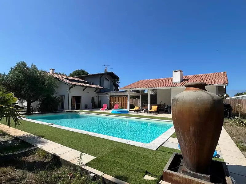 Le salon s'ouvre largement sur l'extérieur, créant un dialogue naturel entre la maison et le jardin. Une grande piscine vient prolonger cette impression de vacances au quotidien. À l'abri des regards, elle devient le cœur battant de la maison dès les beaux jours.
