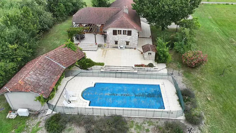 A VENDRE avec l'Agence Le Pic du Quercy. Situé à 12 minutes de Castelnau Montratier, village médiéval avec toutes commodités. *Description de la propriété :* Venez découvrir cette charmante authentique propriété de vacances avec piscine, à la campagne implantée sur un terrain de 7488 m² enveloppant, garantissant absence de voisin proche et calme. *Caractéristiques:* - Chambres : 5 (dont 3 avec salle de bains) - Cuisine : Vaste et entièrement équipée - Salon : Espace confortable avec une grande cheminée à foyer ouvert - Pièces supplémentaires : Salle de bain, buanderie - Équipements extérieurs : - Grande terrasse exposée sud-ouest avec barbecue - Piscine chauffée et clôturée -Grand Pool-house avec auvent - Puits - terrain Profitez du calme et de la sérénité de la campagne tout en étant idéalement proche des commodités. Toulouse Blagnac 1h