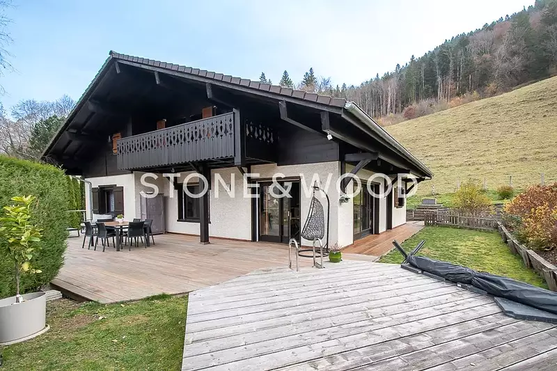 Edifiée en 2001, puis soigneusement rénovée et entretenue, cette jolie maison aux allures de chalet offre env. 300 m2 utiles dont 195 m2 habitables.