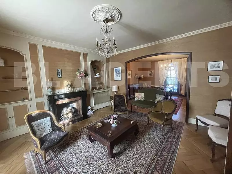 Belle entrée avec son escalier central, son séjour double avec parquet à pointes / cheminée / moulures, son bureau (possible d'en faire une chambre),salle d'eau, coin cuisine et salle à manger