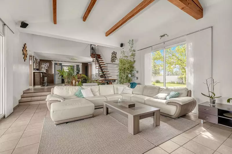 Dès l'entrée, vous serez séduit par une vaste pièce de vie déplafonnée de 60 m², baignée de lumière, comprenant une cuisine entièrement équipée, une salle à manger conviviale et un salon traversant ouvrant sur l'extérieur.