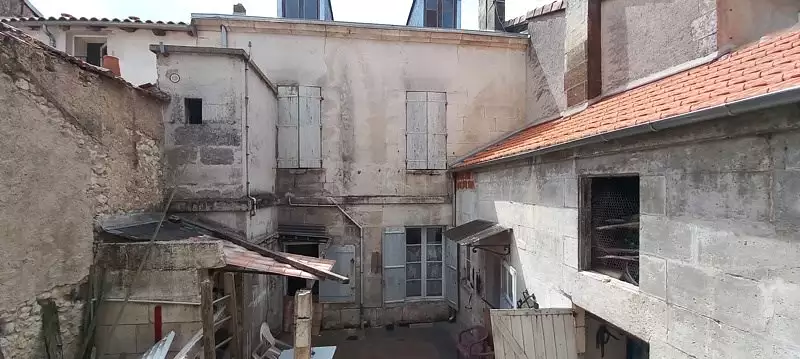 Cette maison de ville avec toiture en ardoise comprend: entrée, cuisine, cellier, salle à manger, salon. Le premier étage offre deux chambres, salle de bain , wc. Le deuxième étage compte trois pièces à aménager. Elle dispose d'une cours, d'un jardinet et d'un garage. Le bien est vendu loué. Travauxde mises aux normes à prévoir.