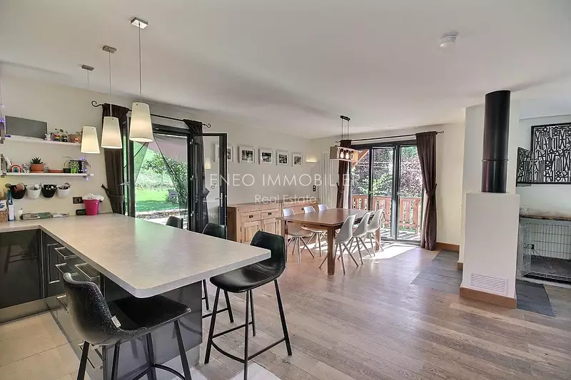 Édifiée sur deux niveaux, cette propriété offre de beaux volumes et une organisation idéale pour accueillir famille et invités. Elle dispose de deux chambres en suite avec salle d'eau et WC privatifs, de deux chambres indépendantes accompagnées d'une salle de bain avec WC, ainsi que d'une très grande suite parentale comprenant salle de bain, salle d'eau, WC privatifs et dressing. Deux autres chambres et un WC séparé complètent l'espace nuit.L'espace de vie principal se compose d'un vaste séjour lumineux avec salon et cuisine ouverte, donnant directement sur la terrasse et le jardin. Exposée Sud-Ouest, la maison bénéficie d'un ensoleillement optimal.Le terrain arboré accueille une piscine hors-sol, une belle terrasse à l'abri des regards, un grand garage et des places de stationnement extérieur. Située dans un village calme à proximité immédiate de Bourg-Saint-Maurice, cette maison conjugue confort, intimité et cadre naturel exceptionnel.