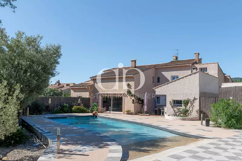 Dehors, à l'abri des regards, un très bel espace piscine avec autour un pool house avec four à pizza, une douche solaire. De l'autre côté de la maison, un jardin potager et un parking.