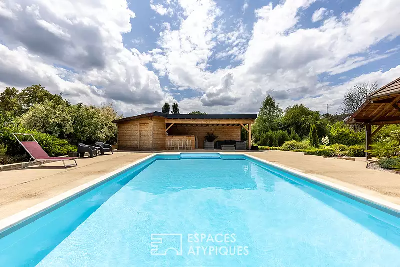 Dans un environnement calme et verdoyant, à seulement 10 minutes de Mont-sous-Vaudrey, cette maison construite en 2004 développe une surface habitable de 200 m². Elle prend place sur un terrain arboré de près de 3 100 m², avec une belle vue dégagée sur la nature environnante. L'accès à la propriété se fait par un portail motorisé, ouvrant sur une grande cour. Le rez-de-chaussée comprend un hall d'entrée, une cuisine indépendante, un vaste salon-séjour baigné de lumière avec cheminée et belle hauteur sous plafond, un bureau, une salle de bains ainsi qu'une buanderie. A l'étage, une mezzanine aménagée en coin TV, cinq chambres et une salle d'eau, offrant un agencement idéal pour une grande famille ou pour recevoir. Un double garage et une cave complètent l'ensemble. A l'extérieur, les prestations sont au rendez-vous : coin repas couvert, piscine équipée d'un dôme, pool house avec bar, et un grand terrain plat évoquant l'ambiance d'une maison de vacances. Une propriété idéale pour une famille nombreuse ou pour les amateurs de tranquillité, d'espace et de convivialité, à seulement 10 minutes des commerces. Ecole à proximité. CLASSE ENERGIE : D / CLASSE CLIMAT : B - Montant moyen estimé des dépenses annuelles d'énergie pour un usage standard, indexées aux années 2021, 2022, 2023 : entre 2794 euros et 3780 euros. (abonnement compris). Les informations sur les risques auxquels ce bien est exposé sont disponibles sur le site Géorisques pour les zones concernées. Benoit CHABOD (RSAC: 948220504): 0688577292 Benoit CHABOD (EI) Agent Commercial - Numéro RSAC : 948220504 - Besançon.