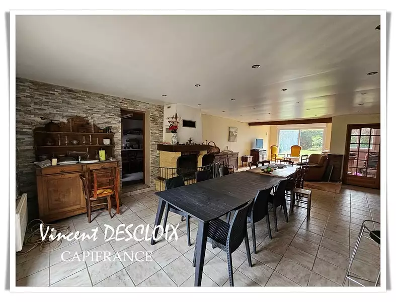 Vous découvrirez au rez de chaussée, un vaste salon de 55m² avec cheminée et porte fenêtre donnant accès à la terrasse, une cuisine ouverte, trois chambres, une salle de bains avec WC, une buanderie, un cellier.