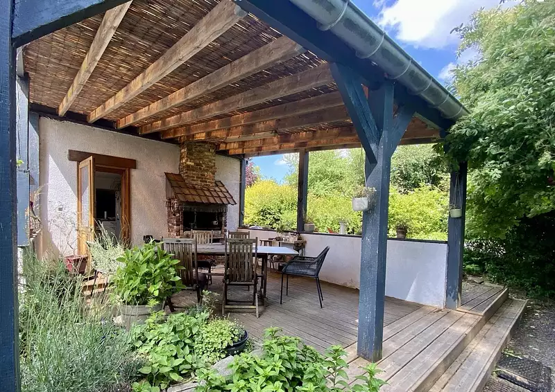 À l?extérieur, un magnifique terrain arboré de 5 500 m² vous promet une intimité rare et une connexion unique avec la nature. Une dépendance ainsi qu'une élégante pergola viennent parfaire cet environnement enchanteur, idéal pour les amoureux de grands espaces, de tranquillité et d?animaux.