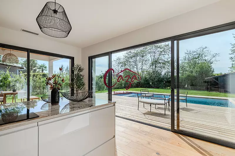 Maison sous offre EXCLUSIVITE CAZA Immobilier CAZA Immobilier vous propose de découvrir en exclusivité cette magnifique villa neuve, idéalement située sur les hauteurs recherchées de la commune de Latresne. Construite selon la norme RE 2020 et bénéficiant de la garantie dommage-ouvrage, cette maison offre des prestations haut de gamme et un confort de vie remarquable. Elle se compose comme suit : Une entrée élégante avec placard, ouvrant sur un patio intérieur Un vaste espace de vie de plus de 85 m², lumineux, avec cuisine ouverte haut de gamme et accès direct à une terrasse couverte. Un cellier/buanderie fonctionnel d'environ 10 m² Une suite parentale avec dressing et salle de bains Une seconde suite avec dressing et salle d'eau Deux chambres supplémentaires, aux beaux volumes Un garage isolé de plus de 40 m², équipé d'une porte sectionnelle motorisée Une parcelle paysagée de plus de 1 200 m², accueillant une piscine traditionnelle et une grande terrasse en bois Cette villa clé en main saura séduire les amateurs de modernité, de confort et de calme. Pour toute information complémentaire ou pour organiser une visite, l'équipe CAZA Immobilier se tient à votre entière disposition par mail ou par téléphone.