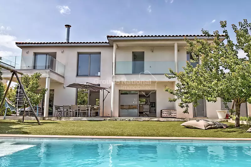CANDILLARGUES Venez découvrir cette superbe villa d'architecte , construite en 2016, idéalement exposée au sud. Offrant 200 m² habitables, elle est implantée sur un terrain de 730 m² paysagé . Au rez-de-chaussée, vous serez séduits par une vaste pièce de vie baignée de lumière de près de 70 m², intégrant une cuisine haut de gamme entièrement aménagée et équipée, prolongée par un cellier attenant. Une suite parentale avec salle d'eau et WC complète ce niveau. L'étage, à la fois moderne et original dans sa conception, accueille quatre chambres, une salle de bain avec baignoire et douche, un WC ainsi qu'une seconde suite parentale de 25 m² comprenant une salle de bain privative et un dressing. A l'extérieur, vous profiterez d'un magnifique jardin avec sa piscine de 9m /3.5 m. Un garage de 21 m² vient parfaire l'ensemble. Cette villa possède tout le confort moderne, à savoir : - Plancher chauffant et rafraîchissant - Climatisation gainable à l'étage - Ballon thermodynamique - Adoucisseur d'eau - Piscine au chlore - Forage - Arrosage automatique Idéalement située à seulement 20 minutes des plages, de Montpellier et de l A9. Pour plus de renseignements , n'hésitez pas à nous contacter et venez visiter ce bien d'exception . Vidéo disponible sur demande .