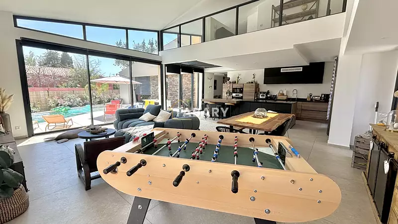 L' Agence TABARY Immobilier vous propose de venir découvrir cette magnifique villa T5, répondant aux normes RE 2020 de 200m2, nichée sur une parcelle de 777m2 arborée et qui comprend en rez-de-chaussée : Une entrée, un spacieux séjour cuisine équipée avec ilot central, de 2 suites parentales dont une de 31m2, d'un bureau et d'un garage. A l'étage vous trouverez, 2 chambres avec placard, une salle de jeux et une salle d'eau.