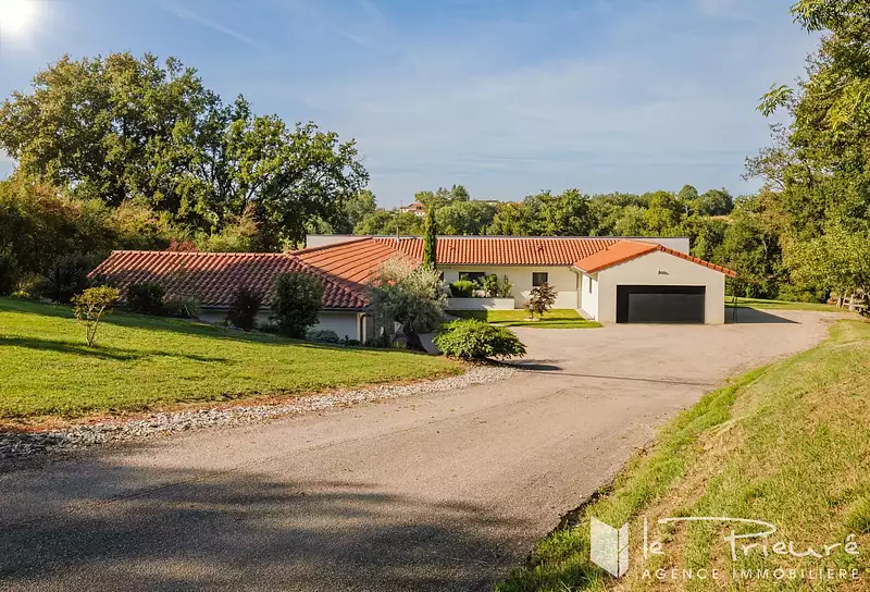 A seulement 20 minutes du centre-ville d'Albi, mais proche de toutes les commodités (commerces, écoles, bus), découvrez cette superbe maison d'architecte de 2013, offrant environ 200 m² (surface de référence selon le diagnostic de performance énergétique - DPE) avec une piscine chauffée. Nichée dans un environnement calme et verdoyant , la villa est implantée sur les hauteurs d'un terrain arboré et vallonné de 1,3 hectare, elle bénéficie d'une vue imprenable et d'une exposition idéale. Entièrement de plain-pied, cette villa de type 7, au design moderne et épuré, se distingue par sa grande luminosité, grâce aux nombreuses baies vitrées qui offrent une vue sur les différents espaces paysagers environnants. Elle se compose notamment de : - Un hall d'entrée avec placard, - Un salon avec espace bibliothèque de 40 m², - Une cuisine avec cellier attenant et une salle à manger, pour une surface totale de 35 m². Ces pièces de vie très lumineuses s'ouvrent sur deux belles terrasses, dont une de 21 m², entièrement couverte et abritée, prolongeant l'espace jusqu'à la piscine et ses plages intimistes. La maison dispose de deux espaces nuit bien distincts : - Le premier dessert deux chambres, un grand dressing, une salle d'eau et des toilettes, - Le second, à l'opposé, dessert trois chambres supplémentaires, une salle de bains et des toilettes. Cette maison allie confort de vie et prestations de qualité, avec notamment un poêle à granulés dans le séjour, une climatisation (PAC) récente par pompe à chaleur (5 splits), un garage de 40 m² avec buanderie, un deuxième garage de 70 m² et un abri voiture de 30 m². La piscine, chauffée par pompe à chaleur également et la production d'eau chaude sont assurées par un système thermodynamique. La maison est classée DPE B. Pour plus d'informations, n'hésitez pas à nous contacter.