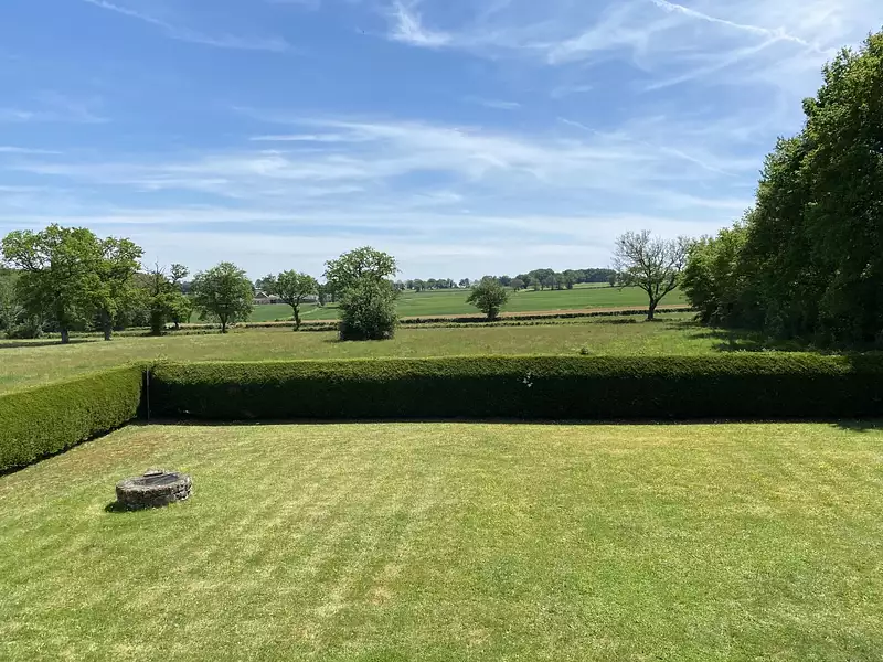 Jardin plat et clos d'environ 4500m2 avec un puits et terrasses attenantes à la maison.