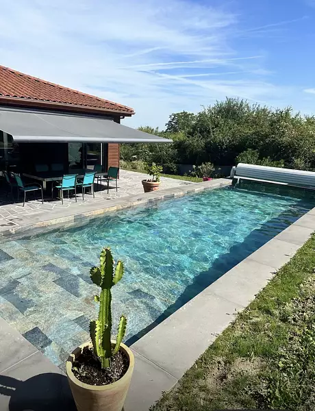 À l’extérieur, le charme opère immédiatement : une vaste terrasse s’étend face à une piscine exceptionnelle en pierre de Volvic brute, véritable œuvre minérale au caractère rare. L’ensemble est enveloppé d’une ossature en bois de Cumaru, soulignant le soin apporté aux matériaux et à l’esthétique.