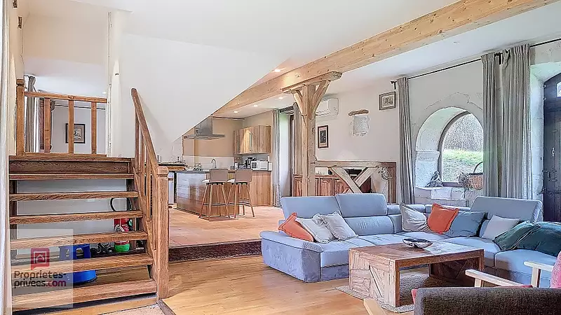 Le logis, rénové en 2018, offre de beaux volumes. La charpente d'origine, est impressionnante par ses belles sections qui raviront les amateurs d'ouvrages traditionnels.