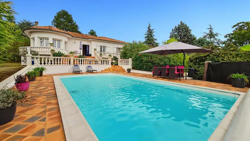 Hauteur d'Agen, avec vue dégagée, dans quartier recherché, villa d'environ 200 m² habitable en parfait état d'entretien, construction de qualité sur terrain paysagé de plus de 2000 m² avec piscine et vaste terrasse.