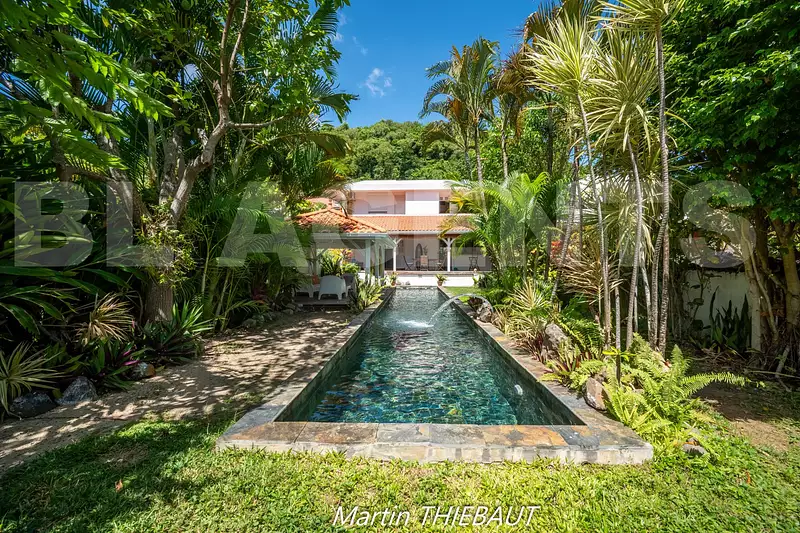 À l'extérieur, le charme s'intensifie : un terrain de 500 m² arboré, un grand carbet convivial, une vaste terrasse couverte, et surtout une piscine de type couloir de nage qui s'étire face à la mer, comme une invitation permanente à la contemplation.
