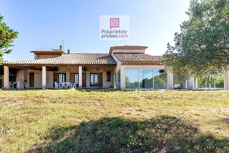 83560 La Verdière, 20mn de Barjols, Rians, Ginasservis : A découvrir en visite virtuelle interactive disponible en ligne, très belle bâtisse de caractère sur grand terrain avec piscine intérieure. Son style et sa qualité de construction traditionnelle lui apportent son aspect cossu et ses vastes et nombreux espaces de vie riches en lumière lui confèrent un profil convivial, confortable et familial. Elle offre quelques 7 à 8 pièces desservies par un impressionnant séjour cathédrale, ainsi qu'une immense terrasse couverte avec cuisine d'été barbecue four à pizza, le plus surprenant étant sa piscine carrelée inscrite dans une salle de 80m2 fermée et éclairée de grandes baies vitrée coulissantes. Absence de vis-à-vis, terrain avec belle vue dégagée sur nature, exposition plein sud, chauffage central par ventilation au sol, belle cheminée en pierre, majestueux escalier central, menuiseries en bois imputrescible de Niangon, mezzanine, buanderie, garage, vide sanitaire, puits et petit cabanon pierre en annexe complètent ce bien. Coup de coeur assuré en son état ou en se projetant avec quelques touches de mise au goût, rénovation et/ou modernisation. Prix de vente : 550K euros incluant les honoraires d'agence à la charge du vendeur. Renseignements et visite sur place auprès de votre conseiller Vincent Delalaing (06 14 24 00 14 ou ), agent commercial médaillé du réseau immobilier SAS Propriétés Privées RCS 487 624 777. Agréé Fnaim, ce réseau de professionnels vous conseille, garantit et sécurise votre projet immobilier. Mandat 409266DGV. Les informations sur les risques auxquels ce bien est exposé sont disponibles sur le site géorisques : www. georisques. gouv. fr