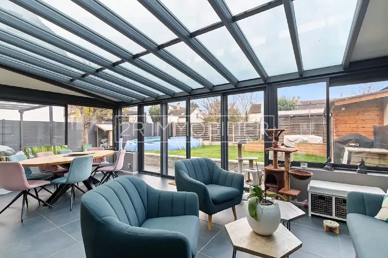 - une entrée ouvrant sur plus de 65 m² de pièces de vie comprenant un séjour cosy avec poêle à bois, une cuisine dinatoire, une salle à manger ainsi qu'un salon sous véranda, le tout donnant accès à deux terrasses intimistes, dont une équipée d'une pergola ;