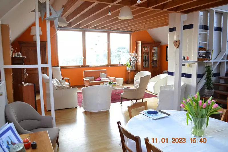 RARE. Maison d'architecte de 1989, en ossature bois, avec de grand volumes, une vue exceptionnelle sur la Loire et Trentemoult, 200 m² habitable, 250 m² au sol Comprenant salon-séjour de 55 m² avec cheminée, cuisine aménagée/équipée, 6 chambres, bureau, 2 sde et 1 sdb. Studio. Garage, cave, atelier. Maison lumineuse, calme, dans une petite rue. Ce n'est pas la maison de tout le monde. (3.70 % honoraires TTC à la charge de l'acquéreur.)