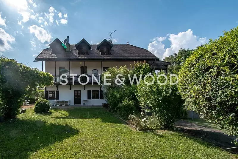 Idéalement située à quelques pas du lac d'Annecy et du centre village de Saint-Jorioz, bâtisse de charme des années 1930s pleine de cachet, nichée dans un écrin de verdure de plus de 800 m2.