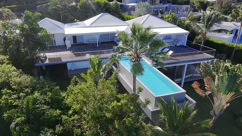 SAINT-MARTIN : villa de prestige et de plain-pied dans un lotissement sécurisé. Sa pleine vue mer, sa piscine rectangulaire à débordement de 12m sur 4m et ses somptueux volumes, tant intérieurs qu'extérieurs, lui confèrent tous types d'utilisation (résidence principale) et d'exploitation (location de vacances). Excepté un groupe électrogène, rien ne manque à cette demeure luxueuse dont les jardins et abords sont magnifiquement entretenus. L'ASL dans laquelle se trouve cette maison de luxe possède de très petites charges de colotis, et dispose de lampadaires solaires, puis de deux portails motorisés, lesquels sont auto surveillés par des caméras. Ce produit immobilier d'exception s'adresse à des connaisseurs à la recherche de vents des Alizés toute l'année durant et de grand calme. Le prix inclus le mobilier. Contact = et +590 690 411 707. (7.07 % honoraires TTC à la charge de l'acquéreur.)