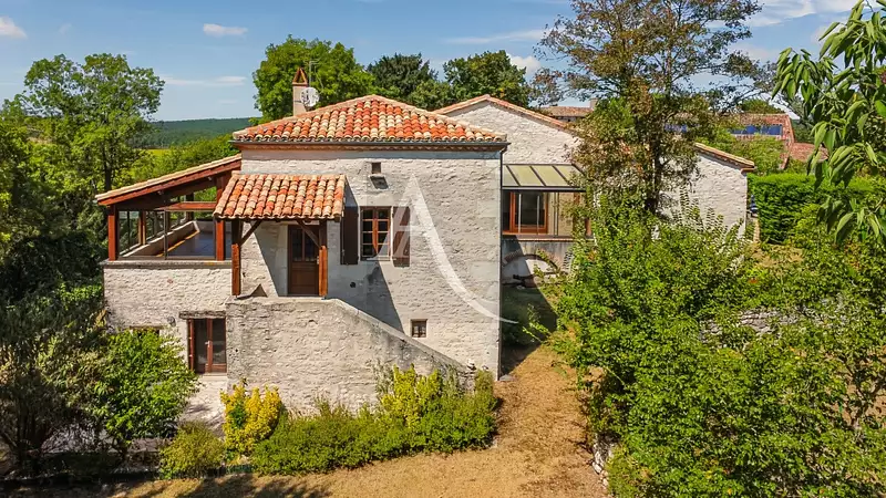 Belle demeure en pierres blanche du Quercy ... EXCLUSIVITE !! Charmante maison en pierre située dans un ravissant hameau, comprenant un appartement indépendant au rez-de-jardin et une superbe piscine. Au rez-de-chaussée, l'appartement dispose d'une agréable terrasse, d'une cuisine fonctionnelle, de deux chambres, d'un salon, et d'une salle d'eau avec WC. Quelques rafraîchissements sont à prévoir. A l'étage, vous serez séduit par un vaste salon (55 m²) aux éléments anciens élégants, équipé d'un insert. La cuisine (13 m²) est entièrement aménagée et donne accès à une véranda . Un vaste couloir dessert quatre chambres, dont une bénéficiant d'un accès extérieur (13 m²) et deux autres (10 m²) s'ouvrent sur une véranda offrant une vue imprenable sur la campagne environnante. Vous trouverez également un WC avec lave-mains ainsi qu'une salle d'eau équipée d'une douche à l'italienne (6 m²). Une maison tres lumineuse, en pleine verdure !!! Confort : chauffage électrique panneaux rayonnants, et cheminée à foyer ouvert. Dépendances : un garage avec mezzanine pour le rangement et un atelier avec point d'eau . Terrain : 2246 m² parfaitement arboré, agrémenté d'un bel espace piscine entouré de sa terrasse. Une occasion rare à ne pas manquer le coup de coeur de l'agence !