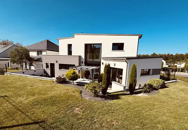 Prestations haut de gamme et décoration soignée pour cette très belle maison contemporaine construite en 2021 composée au rez-de-chaussée : d'un hall d'entrée avec placards, un WC avec lave mains, une suite parentale avec salle d'eau et dressing, une grande pièce de vie baignée de lumière d'environ 68m² avec cuisine américaine entièrement équipée, une arrière-cuisine aménagée, un accès au double garage et un cellier/chaufferie avec WC. A l'étage : une mezzanine spacieuse, cinq chambres de belle taille, de nombreux rangements /dressings, une salle de bains avec douche et baignoire et un WC. Terrasse exposée Sud. Agréable terrain clos et paysagé d'environ 590m². La maison est en parfait état général, très lumineuse et fonctionnelle, les matériaux sont de qualité. Bien rare et recherché. (4.00 % honoraires TTC à la charge de l'acquéreur.)