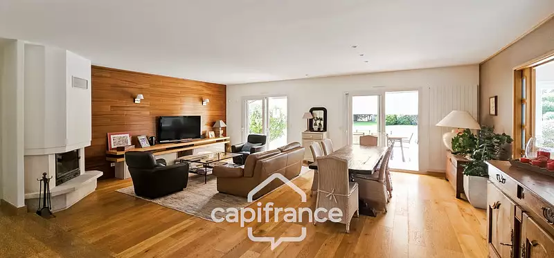 L'espace principal s'ouvre sur un vaste salon-séjour baigné de lumière, agrémenté d'une cheminée, avec vue sur le jardin paysagé et sans vis-à-vis, une cuisine entièrement équipée alliant modernité et convivialité.