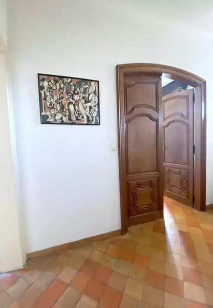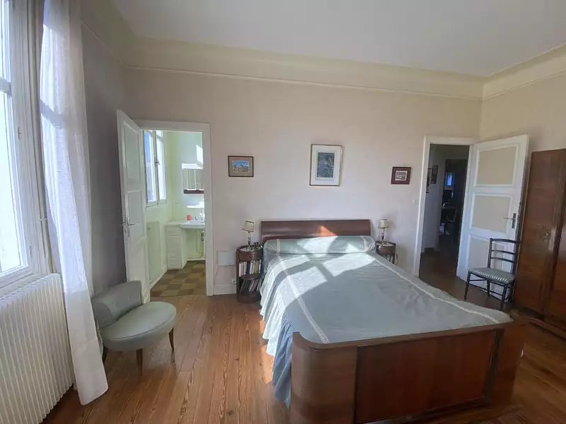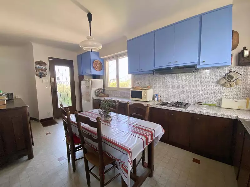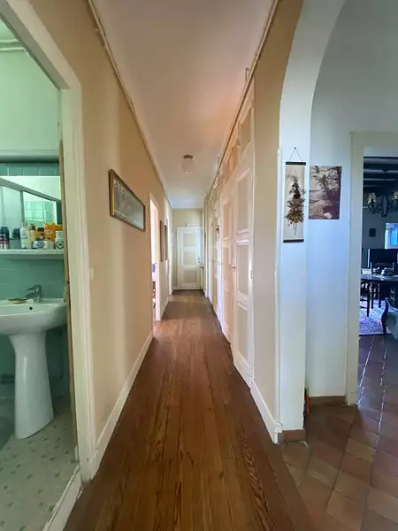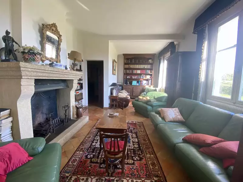 Belle maison de famille à rafraichir de l'architecte Prunetti, offrant sur 2 niveaux : entrée, salon, salle à manger, cuisine indépendante, 7 chambres, salle de bains, salle d'eau, cheminées, parquet bois, portes anciennes, bel escalier, garage double et grande cuisine d'été.