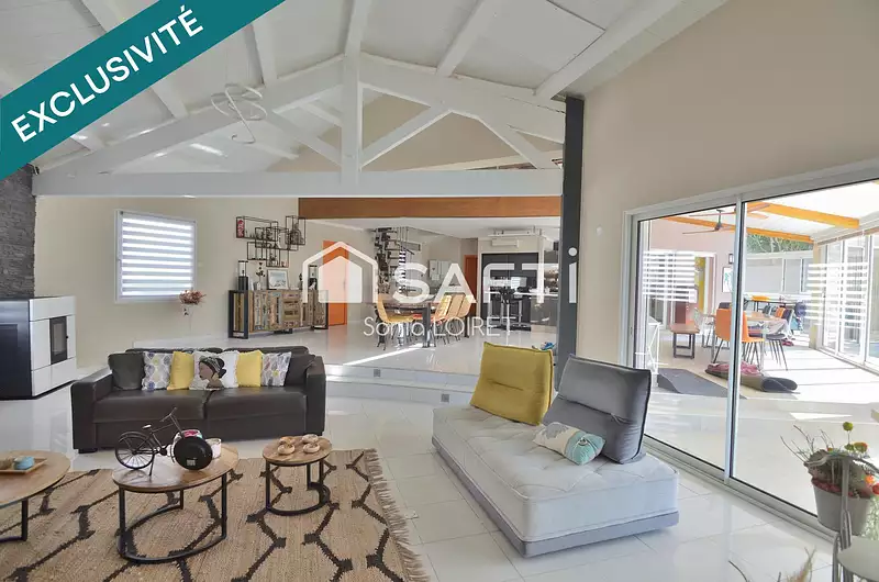Nichée sur un terrain de 1760 m², cette magnifique maison d'architecte offre une expérience de vie unique, alliant confort moderne et cadre naturel exceptionnel. Avec ses volumes généreux et sa luminosité inégalée, vous serez immédiatement séduit par son vaste salon-séjour baigné de lumière, où les poutres apparentes et la mezzanine créent une atmosphère chaleureuse et accueillante. Cet espace de vie peut facilement être transformé en bureau pour les travailleurs indépendants, faisant de cette maison un véritable cocon pour tous.