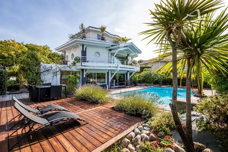 Découvrez cette magnifique maison familiale de plus de 215 m2, offrant des volumes exceptionnels et des prestations haut de gamme. Le rez-de-chaussée propose un vaste salon-séjour-cuisine de plus de 108 m2, une buanderie, une cuisine d'été et un bureau, idéal pour le télétravail ou les activités professionnelles. À l'étage, vous trouverez trois belles chambres, une salle de bains, des WC séparés et une mezzanine lumineuse. Le deuxième étage est dédié à une salle de sport avec une vue imprenable sur le bassin, parfaite pour vos moments de détente. À l'extérieur, profitez d'une piscine pour vos journées ensoleillées, d'un garage spacieux de plus de 60 m2 et d'un terrain arboré de 800 m2. Ce bien rare, saura séduire les familles à la recherche de confort, d'espace et de tranquillité.