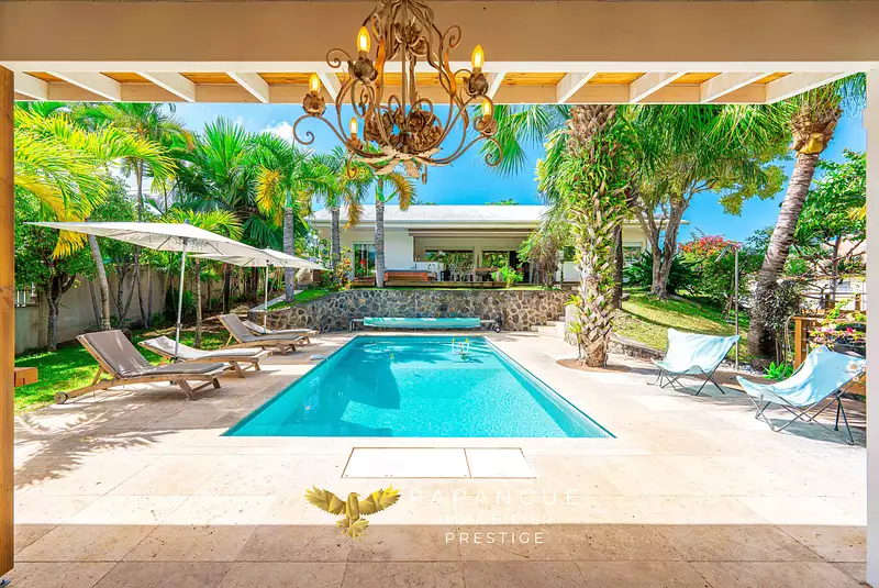 À l’extérieur, la piscine d’une profondeur de 1,80 m repose sur une plage en travertin qui confère à l’ensemble un caractère raffiné et intemporel. Le jardin luxuriant, agrémenté d’arbres fruitiers tels que des manguiers, un carambolier et un cerisier, offre un cadre paisible avec une vue dégagée sur les montagnes et l’océan.