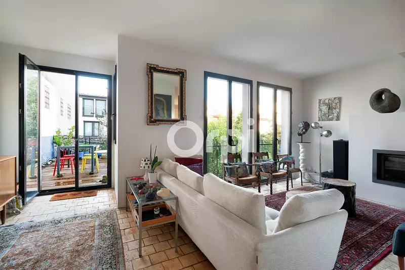 • Un salon lumineux avec cheminée, ouvrant sur une terrasse et un jardin intimiste, véritable havre de paix
