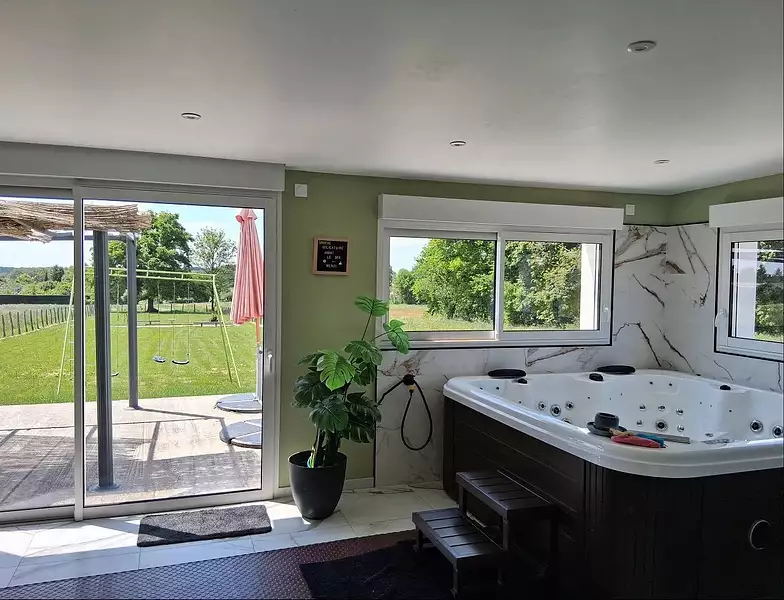 Pièce de vie avec cuisine aménagée et équipée, (poêle à bois), buanderie, WC pièce avec spa, salle d'eau et WC.