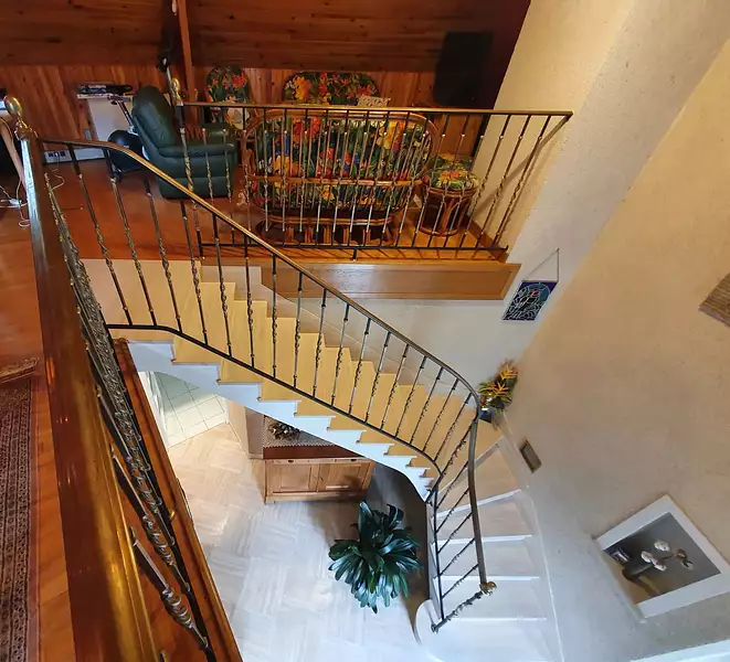 A l'étage étage : un bel escalier dessert une mezzanine de 38 m²(bibliothèque, bureau), deux chambres, une salle de bain, un toilette et un grenier