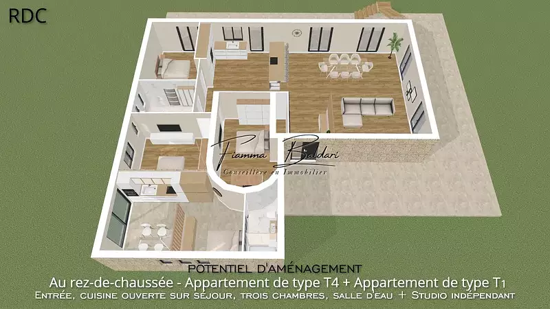 Les projections 3D proposent une réorganisation harmonieuse de l'ensemble : le rez-de-chaussée pourrait devenir un spacieux appartement T4 de plain-pied, idéal pour une famille. Le garage, facilement aménageable, pourrait accueillir un studio indépendant, parfait pour un revenu locatif ou un espace d'accueil. Le premier étage offrirait la possibilité de créer un appartement T3 lumineux, avec une pièce annexe originale dans la tour située au-dessus du salon, pouvant servir de bureau, de coin lecture ou d'espace détente.