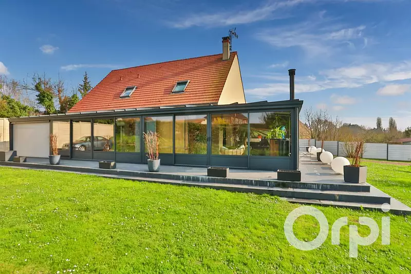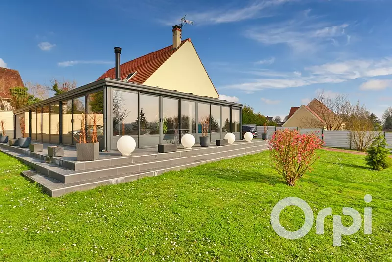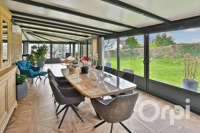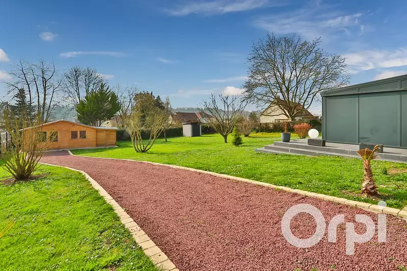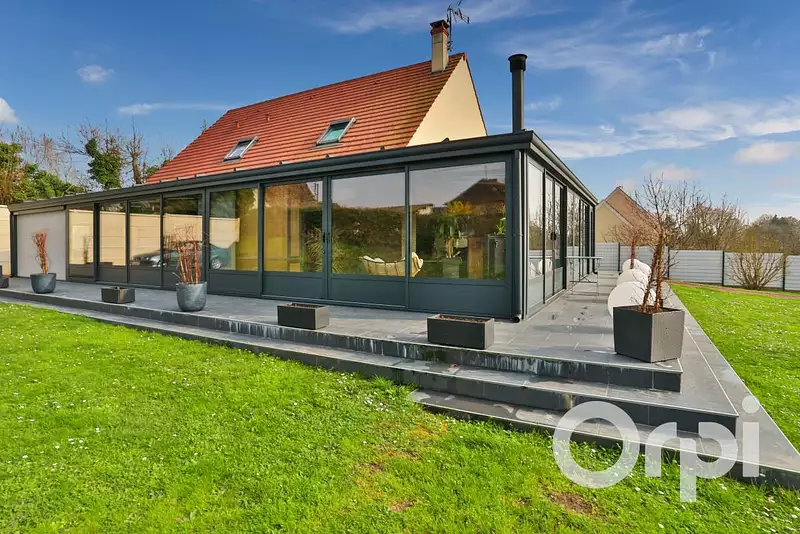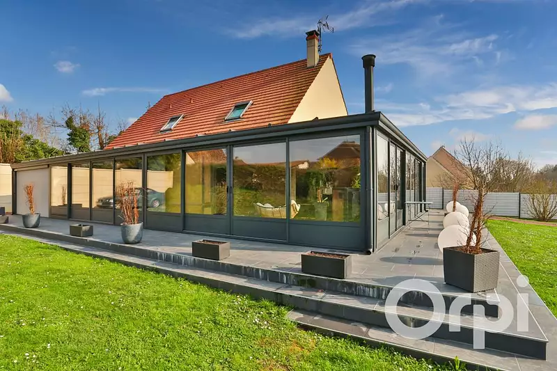7kms de Gisors, dans un bourg tous commerces avec écoles, cantine, garderie et périscolaire, Magnifique pavillon familiale avec plain pied de vie, offrant 207m² habitable : Entrée cathédrale, magnifique pièce de vie avec poêle à granules agrémentée d'une véranda de 80m² et d'une cuisine aménagée et équipée ouverte, arrière cuisine, 1 chambre, salle d'eau avec douche à l'italienne, wc, bureau, A l'étage: Palier, 3 chambres, salle de bains avec baignoire balnéo, douche à l'italienne, double vasque et wc, chauffage pompe à chaleur, chalet de jardin de 38m², le tout sur un jardin clos de 1470m².