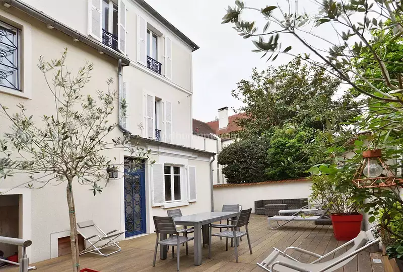 Nogent sur marne dans secteur prisé à 2 pas des bords de marne et du rer a, belle maison bourgeoise édifiée sur une parcelle de 465 m². elle comprend : hall d'entrée, une réception donnant sur terrasse de 70 m2 à l'abri des regards, une cuisine entièrement équipée, 5 chambres, une mezzanine, un bureau, 2 salles de bains, une salle d'eau, un sous sol total avec salle de jeux et un garage. -