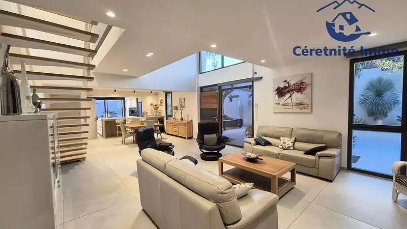 La maison propose une grande pièce de vie lumineuse grâce à ses vastes ouvertures qui favorisent l'entrée de la lumière naturelle. Ce lieu de rassemblement central offre un espace accueillant et fonctionnel, pensé pour répondre aux besoins de la vie contemporaine.