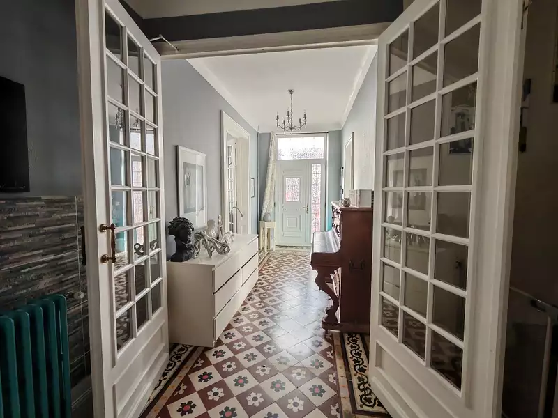 Une belle entrée au carrelage ancien dessert un salon-salle à manger lumineux équipé d'un poêle à granulés et d'une climatisation réversible.